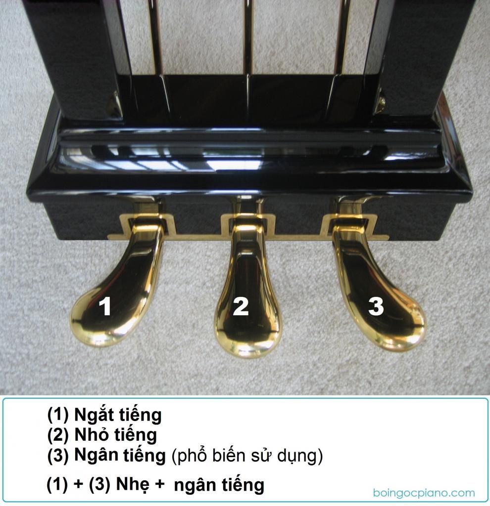 – Pedal (3) được sử dụng phổ biến nhất, nằm ở ngoài cùng bên phải, có chức năng làm tiếng đàn ngân vang hơn. Các bạn có thể thử tác dụng của nó bằng cách bấm 1 phím bất kì trên đàn rồi dậm pedal 3, sẽ thấy âm thanh ngân dài hơn, vang hơn so với khi không dậm, khi đàn nhiều nốt liên tục và dậm pedal sẽ thấy âm thanh giữa các nốt ngân liền chồng lên nhau, không có cảm giác rời rạc. Tuy nhiên khi dậm pedal quá lâu thì sẽ gây cảm giác vang ồn, khó chịu.